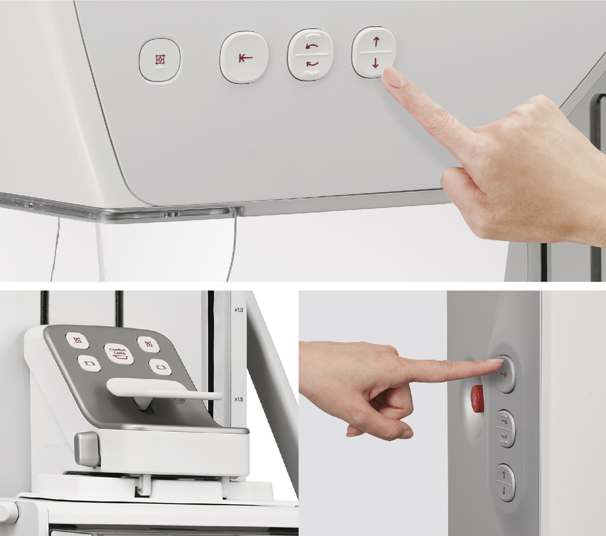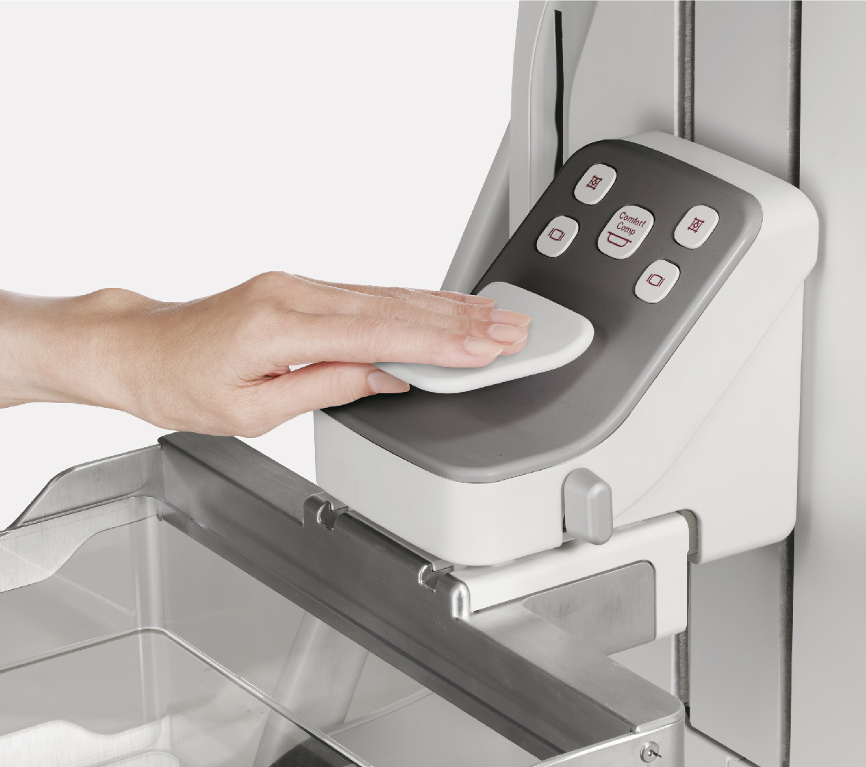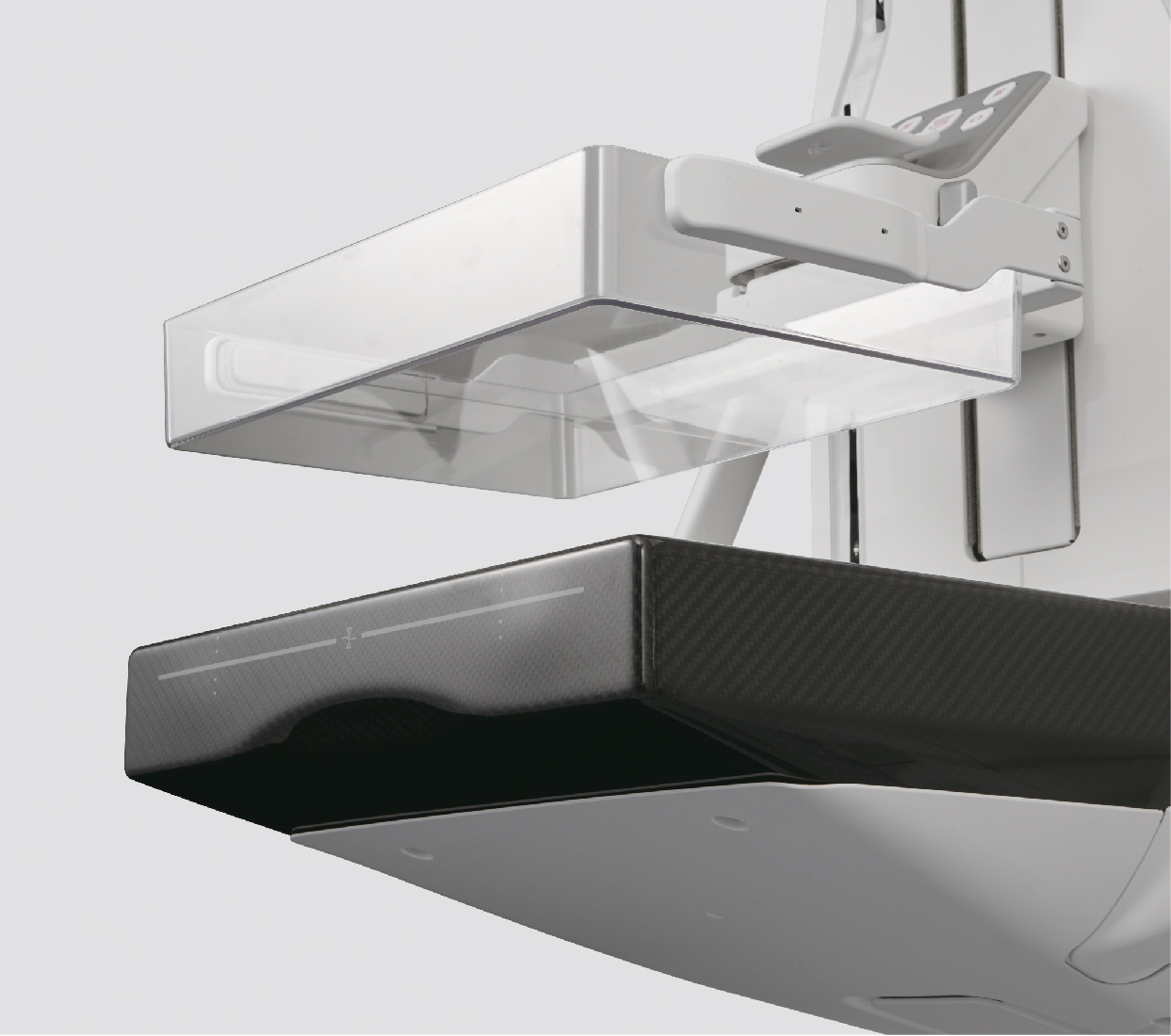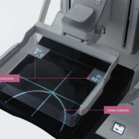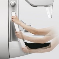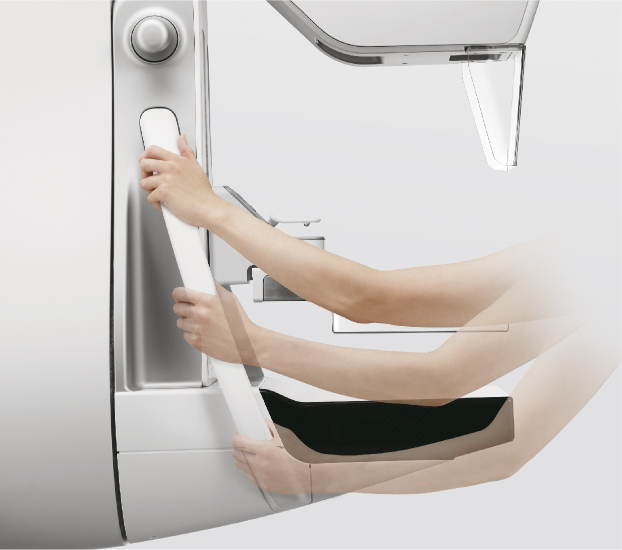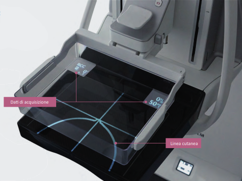 - all'operatore, mediante funzioni di posizionamento del seno assistite da tecnologia IA, con proiezione dell'immagine del seno sul piatto del detettore (Positioning Map) per consentire sempre che non vengano tralasciati dettagli dell'anatomia durante la scansione e garantire la replicabilità delle condizioni di acquisizione nei follow up. Il sistema è costruito con una ergonomia tale da mantenere il tecnico a contatto visivo continuo con la paziente, grazie ai controlli di movimentazione replicati in varie posizioni del mammografo, al controllo manuale della compressione fine che avviene con la mano dell'operatore (e non tramite pedali che non consentono di modulare la forza) e con i dati di acquisizione che vengono visualizzati in prossimità dell'anatomia.